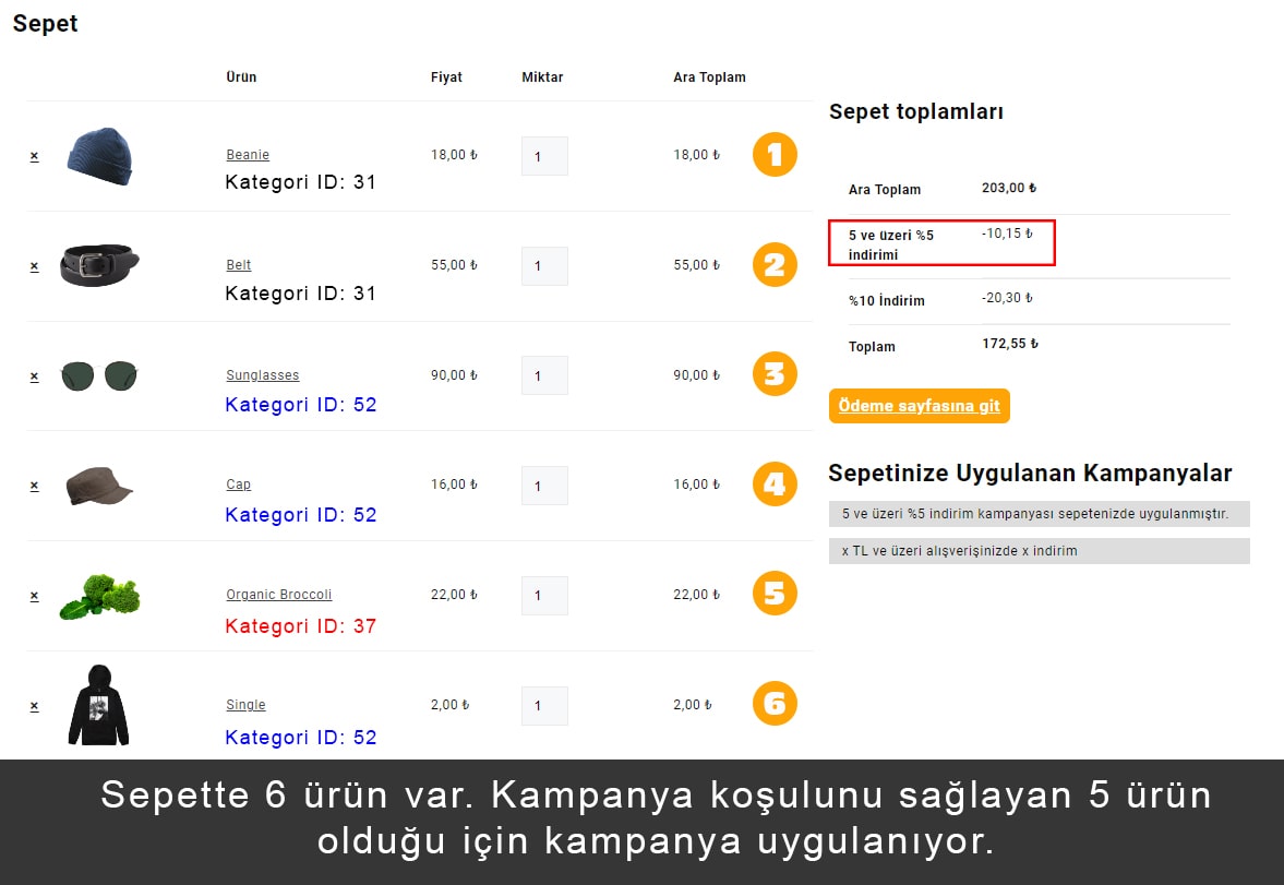 Şimdi belirli ürün kategorisi için örneğin pantolon 5 alım üstünde %5 – 10 ürün alım üstü için de %10 indirim verdim. Bunu kod satırına ekledim.